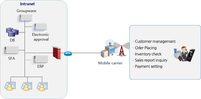 Sales Force Automation (SFA) By using mobile device and mobile radio communication network will provide not only sales but also taking a order, account management, checking information of product, making a payment, and etc. This system will support field force workers to work in better condition and it will occur the great satisfaction from your customers.