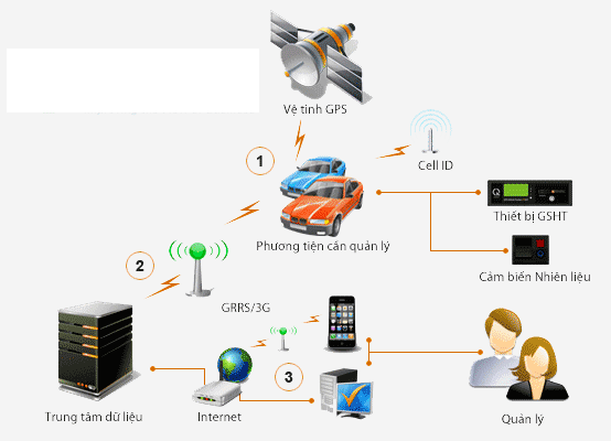 (1): Phương tiện vận tải cần quản lý được gắn thiết bị giám sát hành trình và cảm biến nhiên liệu. Thiết bị thu/phát tín hiệu GPS với vệ tinh và ghi nhận dữ liệu hành trình (vị trí, tốc độ, hướng di chuyển) của phương tiện. Cảm biến nhiên liệu ghi nhận dữ liệu tiêu hao nhiên liệu.